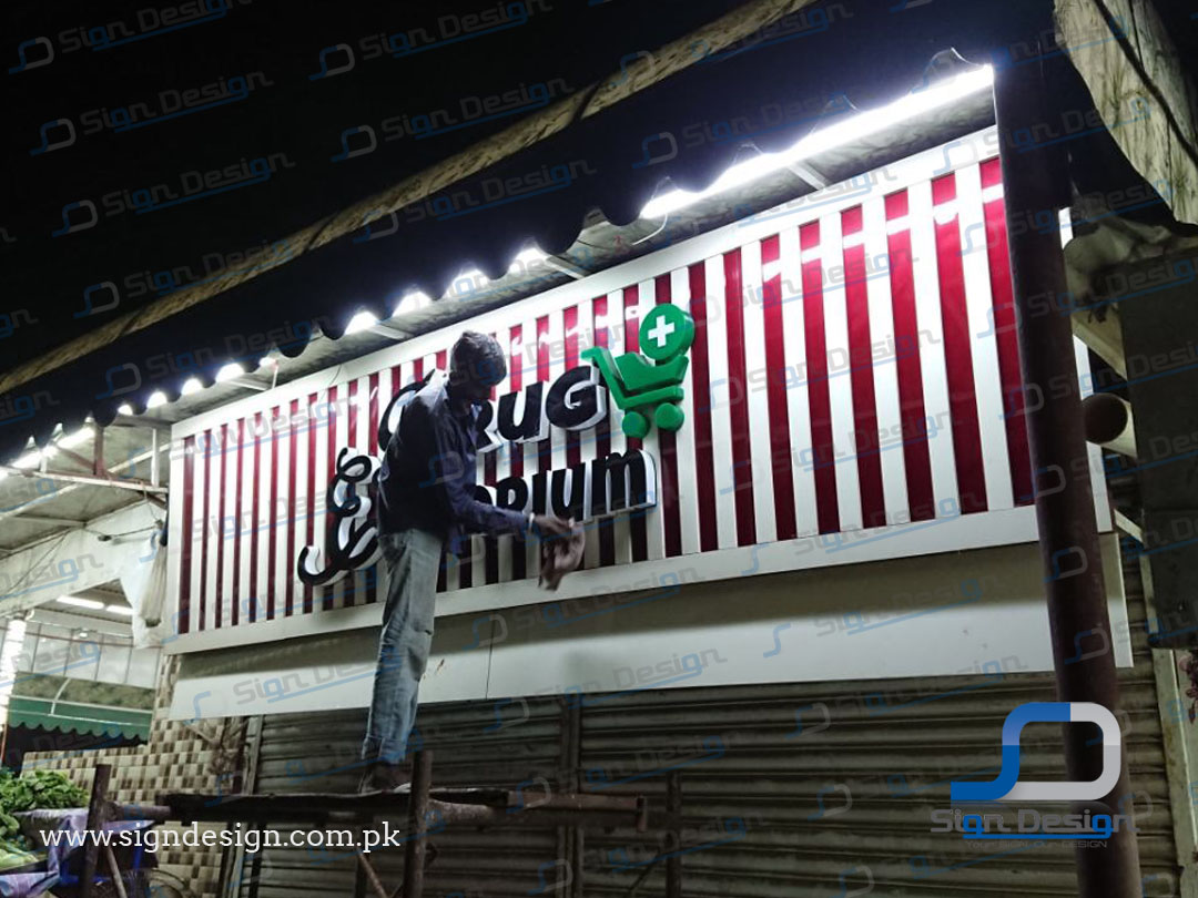 The finished signage gave Drug Emporium a modern and professional identity. The side-glow backlit letters created a premium look, while the green acrylic shopping cart added a distinctive touch that reinforced the store’s purpose. The combination of black and green acrylic with precise lighting effects ensured the store stood out both day and night, attracting customers with a memorable brand presence.
