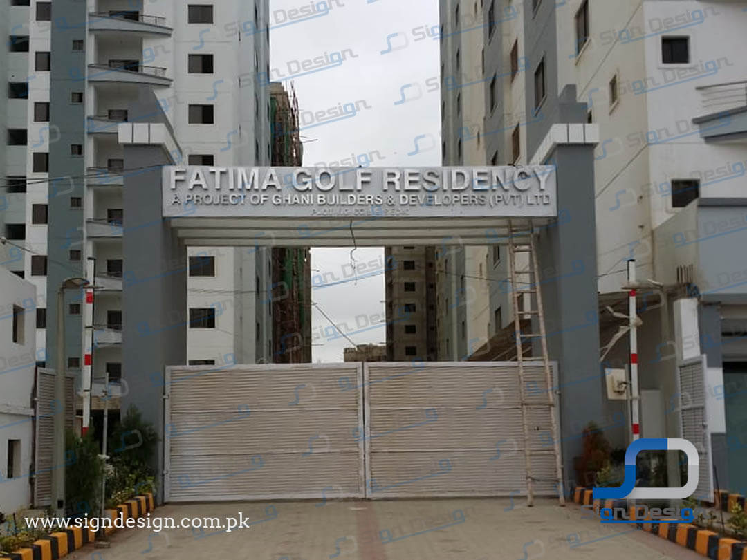 The completed signage now stands as a landmark feature of Fatima Golf Residency. Its sleek metallic look during the day and radiant illumination at night provide a lasting impression, enhancing the overall branding of the property and delivering exactly the premium identity the client envisioned.